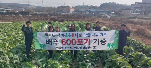 마을주민들은 정성스럽게 경작한 배추 600포기를 김장 봉사를 하는 관내 단체에 전달했다.