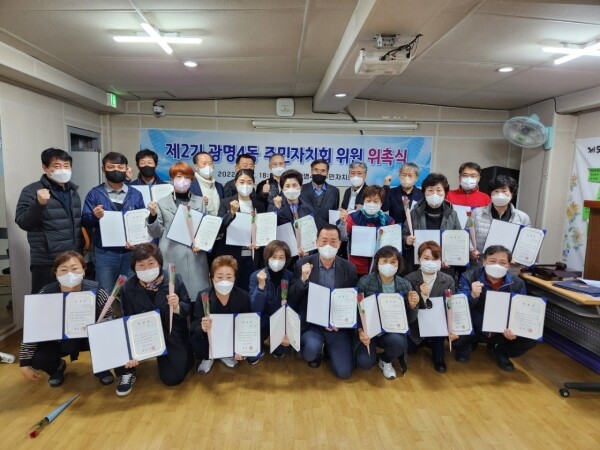 장진한 광명4동장은 “주민들의 이주가 시작되어 주민자치회 활동에 제약이 많은 상황에서도 열심히 활동해주셔서 감사드린다”며 “주민자치회가 더욱더 활성화될 수 있도록 적극 지원하겠다”고 전했다.