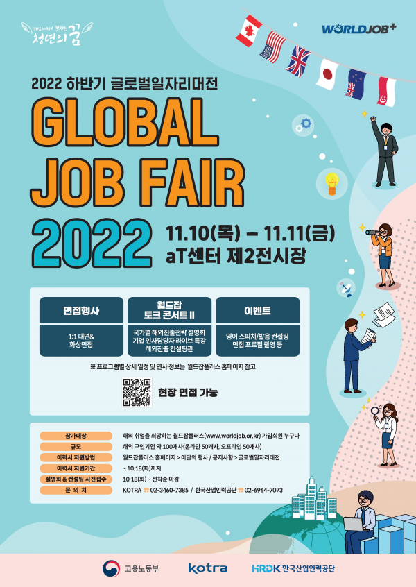 2019년 이후 3년 만에 대면으로 개최되는 이번 행사는 일대일 현장·화상면접 월드잡 토크 콘서트Ⅱ 등 취업 성공을 위한 정보제공부터 면접까지 한 곳에서 이루어질 수 있도록 구성됐으며 구직자들이 다양한 공단의 해외취업지원사업을 확인하고 이벤트에 참여할 수 있도록 월드잡플러스 홍보관도 운영한다.
