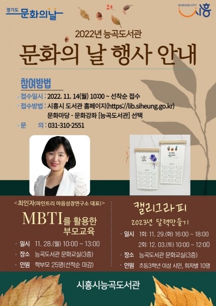 ‘MBTI를 활용한 부모교육’은 오는 11월 28일 월요일 오전 10시부터 3시간 동안 능곡도서관 문화교실에서 학부모 25명을 대상으로 열리며 간단한 MBTI 간이 검사를 통해 유형에 맞는 자녀와 부모의 소통 방법 및 양육법을 알아볼 예정이다.