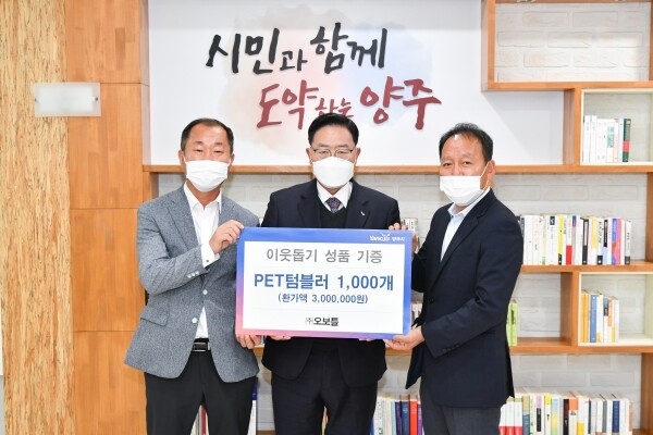 이날 전달식에는 강수현 양주시장, ㈜오보틀 김윤성 대표와 김용선 전무가 참석했으며 기부받은 PET텀블러는 취약계층에 전달될 예정이다.