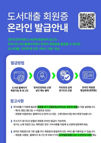 회원증 발급을 원하는 경우 파주시도서관 홈페이지에서 회원가입 후 오른쪽 상단의 ‘온라인 정회원 신청’ 메뉴에 접속해 주민등록번호를 입력하면 즉시 거주지를 확인해 발급이 완료된다.