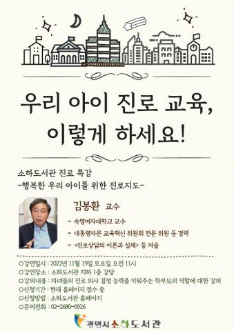 소하도서관 관계자는 “전문성을 가진 교수의 강연을 통해 학부모와 아이들의 진로 선택 과정에서 합리적인 미래를 준비할 수 있는 좋은 경험이 될 것이다”고 전했다.