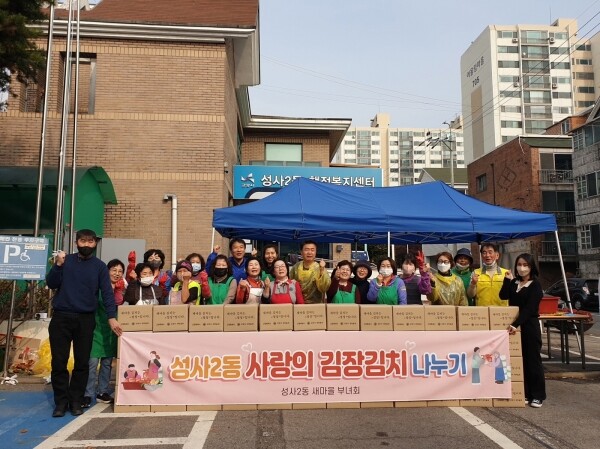 이날 행사에는 성사2동 새마을 부녀회를 비롯한 직능단체 회원들이 직접 김치를 담가, 기초생활 수급자 63가구, 복지사각지대 14가구, 총 77가구에 직접 전달했다.