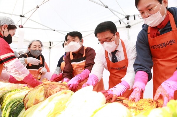 9일 구청 광장에서 진행된 이번 행사는 자원봉사협력단장협의회가 주관하고 함께하는 사랑밭이 절임배추, 양념 등 재료를 후원했다.