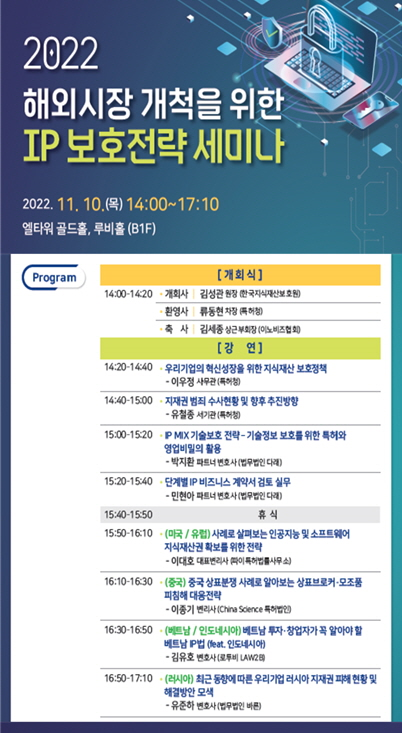 특별히 이번 세미나에서는 특허청, 이노비즈협회, 한국지식재산보호원, 5개 법률 사무소이 참여하는 1:1 상담 공간을 운영해, 해외에 진출하려는 기업들에게 지원사업을 안내하고 지식재산 보호 방안 등 맞춤형 상담도 제공했다.