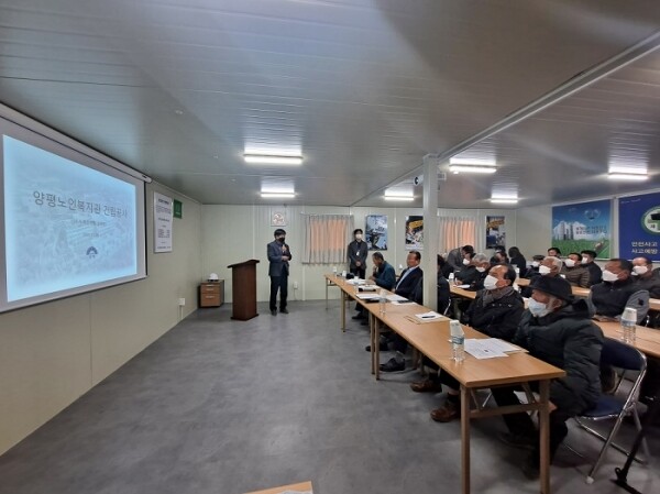 설명회에는 전진선 군수를 비롯해 김용녕 대한노인회 양평군지회장을 비롯한 임원들이 참석, 최선규 회계과장으로부터 공사 추진현황을 보고 받았으며 공사추진과 관련한 질의와 함께 다양한 의견들을 제시했다.
