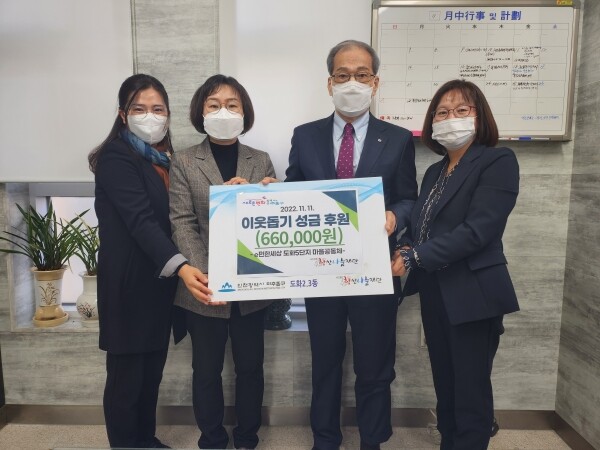 김헌수 e편한세상도화5단지 공동체 대표는 “작년에 이어 마을공동체 사업이라는 좋은 계기로 기부할 수 있어 뿌듯하다”며 “다음에도 좋은 기회가 있으면 꼭 나눔 실천을 위해 노력하겠다”고 말했다.