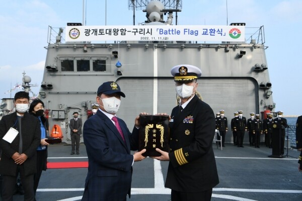 이날 행사는 코로나19 이후 3년 만에 개최됐으며 지난 1년간 광개토대왕함에 게양해온 배틀 플래그와 구리시에서 준비한 새 배틀 플래그를 교환하는 교환식을 시작으로 위문금과 위문품 전달식, 함정 견학 등의 순서로 진행됐다.