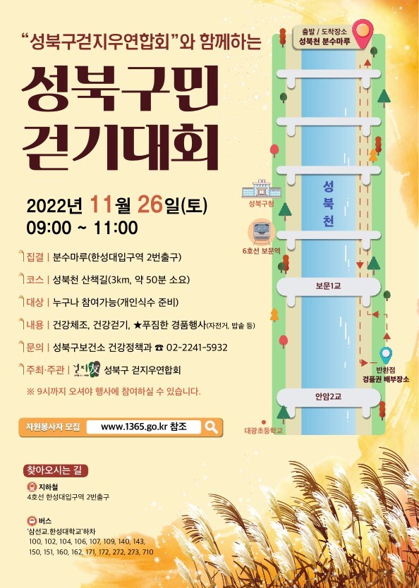 걷기와 건강에 관심 있는 사람이라면 누구나 신청 없이 참여 가능하며 대회 당일 오전 9시 지하철 4호선 한성대입구역 2번 출구 앞 분수마루에서 출발해 성북천의 아름다운 산책길을 50여 분 동안 걷는 코스로 진행된다.