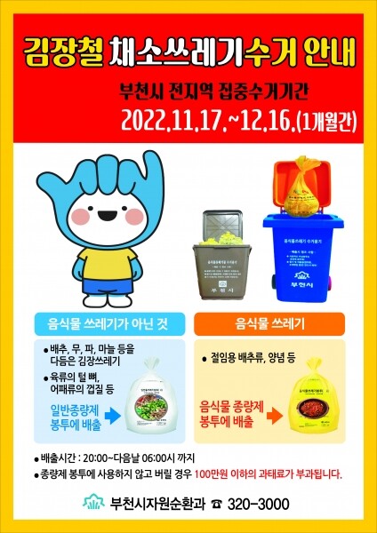 조용익 부천시장은 “김장철 채소 쓰레기의 신속한 수거와 깨끗한 처리가 쾌적한 환경을 조성할 수 있을 것”이라며 “올바른 쓰레기 배출 방법의 정착으로 금년도 김장 쓰레기 발생량이 줄어들 수 있길 기대한다”고 하면서 시민들의 적극적인 협조를 당부했다.