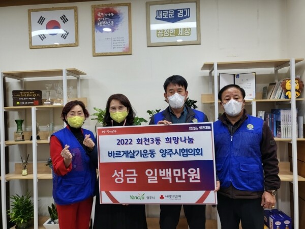 이번 성금은 지난달 29일 회천3동 행정복지센터 어울림마당에서 바르게살기운동 양주시협의회 주최로 열린 바자회에서 의류, 생활용품, 먹거리 판매를 통해 얻은 수익금으로 경기사회복지공동모금회를 통해 독거어르신, 한부모 가정 등 저소득층 지원 사업에 쓰일 예정이다.