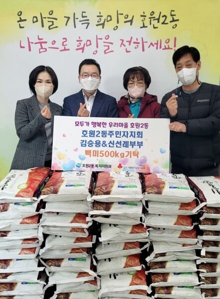 호원2동 주민자치회 부회장 김승용, 신선례 부부는 작년에도 우리 이웃들을 위해 백미 500kg을 전달한 바 있으며 올해 역시 다가오는 겨울을 앞두고 관내 취약계층가구에 전달하기 위해 백미 500kg을 전달하며 100일간 사랑릴레이 배턴 잇기 운동에 동참했다.