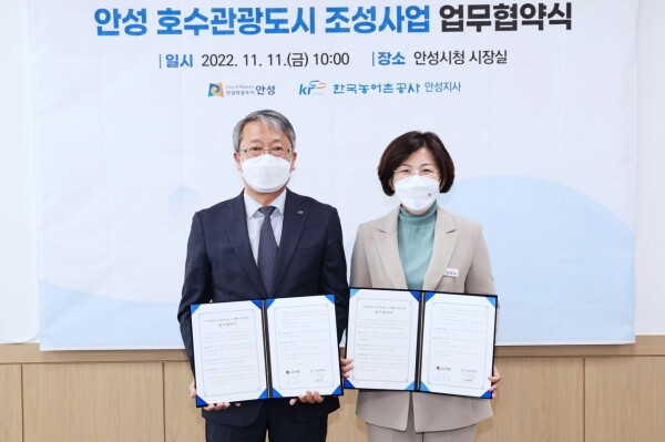 이날 협약식에서 안성시와 한국농어촌공사 안성지사는 상호협력관계를 구축하고 관내 호수를 활용한 여가·휴양·관광도시 조성 및 지역 경제 활성화를 위해 적극 협력할 것을 합의했다.