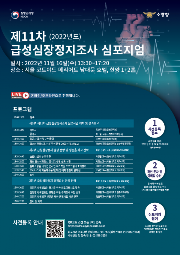 ‘제11차 급성심장정지조사 심포지엄’은 2021년 급성심장정지 환자 발생 현황 및 생존, 심폐소생술 시행 여부 등의 주요 결과를 발표하고 급성심장정지 예방과 생존율 향상 전략을 논의하기 위해 개최한다.