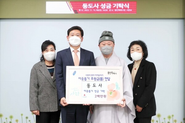시는 16일 동도사 주지 도원스님과 관계자 3명이 이상일 용인특례시장실을 찾아와 성금 200만원을 기탁했다고 밝혔다.