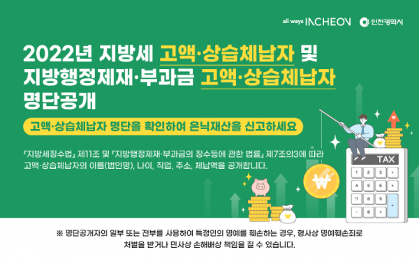 이번 공개대상은 체납기간 1년 이상, 체납액 1천만원 이상인 지방세, 지방행정제재·부과금의 고액·상습 체납자로 인천시 시보, 행정안전부 지방세 신고·납부 서비스 누리집인 위택스를 통해서도 동시 공개했다.