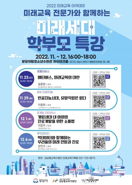해당 강연은 모두 대면으로 분당야탑청소년수련관에서 이루어지며 미래교육에 관심있는 성남시 학부모라면 누구나 무료로 참여 가능하다.