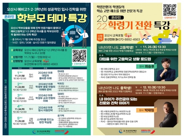 학령기 전환 특강은 예비 고1, 예비 중1 학생 및 학부모를 대상으로 대입을 위한 ‘고등학교 생활로드맵’, ‘내 아이가 주인공이 되는 진로와 진학 이야기라는 주제’로 진행된다.