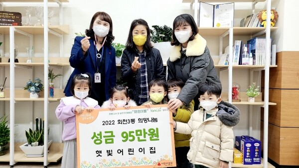 김금숙 회천3동장은“매년 나눔을 실천해 주시는 햇빛어린이집 원장님과 교직원, 학부모님, 원아 모두에게 감사를 드린다”며 “주민 모두가 행복하고 더불어 살아갈 수 있는 따뜻한 회천3동이 되도록 더욱 노력하겠다”고 말했다.