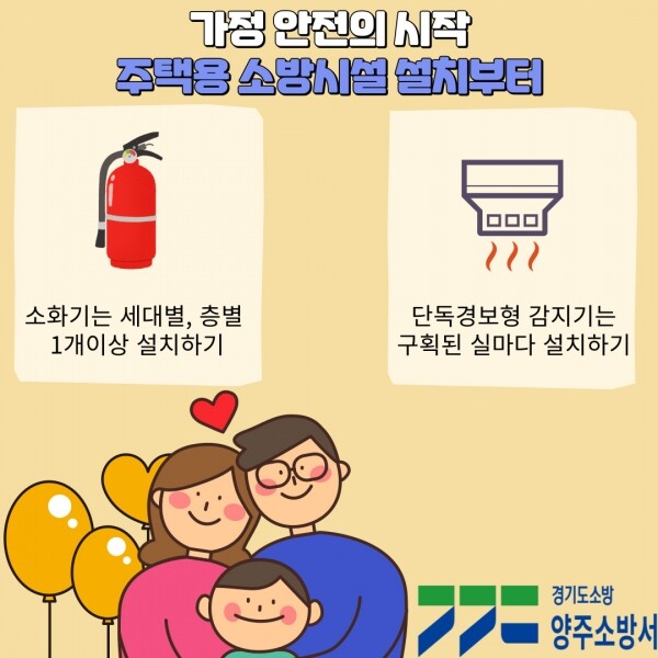 정상권 양주소방서장은 “주택용 소방시설로 인해 인명 및 재산피해가 줄어드는 사례가 늘고 있다”며 “각 가정에서는 주택용 소방시설 설치에 적극 동참해 가정 내 안전을 확보하길 바란다”고 전했다.