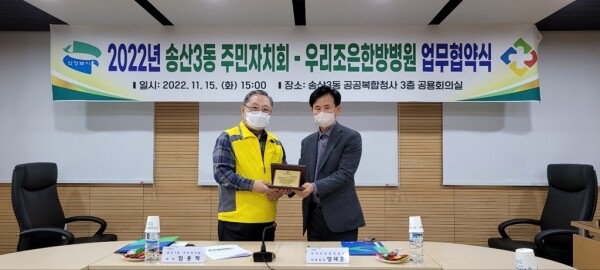 협약식에는 류윤미 송산3동 자치민원과장, 임용혁 송산3동 주민자치회장, 양재훈 우리조은한방병원 대표원장과 주민자치위원 등이 참석해 자리를 빛냈다.