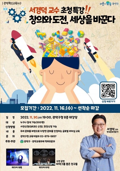 관악혁신교육지구 민·관·학 거버넌스인 관악교육두레와 함께 공동으로 개최하는 이번 강연은 구민 누구나 무료로 참여할 수 있으며 선착순 300명을 모집 중이다.