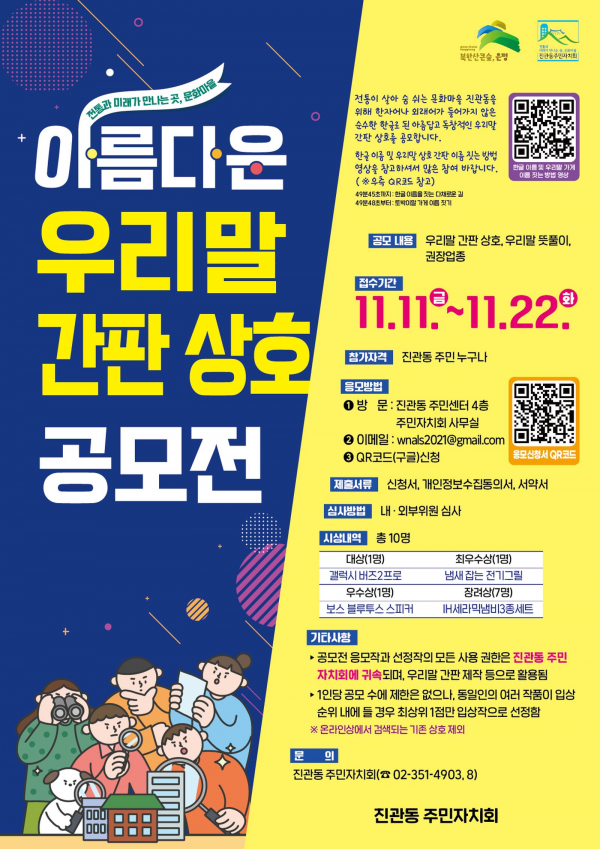순우리말 간판 보급과 한글사랑 문화 확산을 위한 공모전으로 진관동 주민이면 누구나 응모할 수 있다.