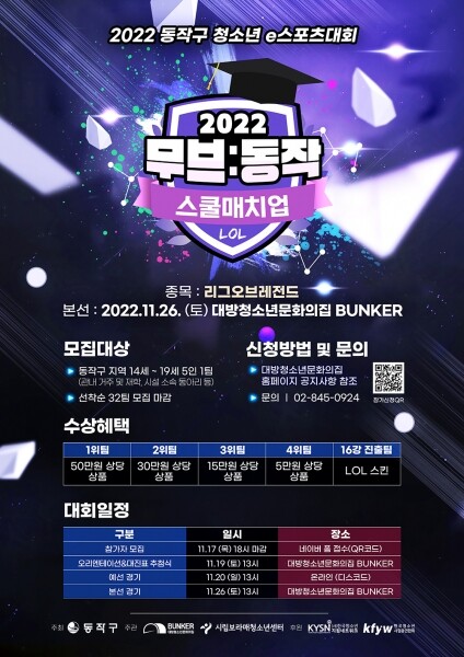 동작구가 주최하고 대방청소년문화의집·시립보라매청소년센터가 주관하는 이번 대회는 ‘동작구 최고의 학교를 찾아라’ 주제로 관내 학교 간 e스포츠 토너먼트를 통해 최강자를 가려낸다.