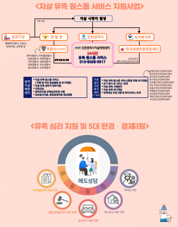 2019년 9월부터 미추홀구·연수구·남동구·부평구 등 4개 구에 자살 유족 원스톱 서비스 시범사업을 시작한 인천시는 올해 7월부터 인천 전 지역으로 확대해 적극적으로 추진한다.