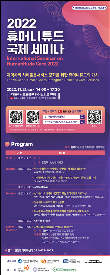 2019년, 2021년에 이어 올해로 3회째를 맞는 이번 국제 세미나는‘지역사회 치매돌봄서비스 강화를 위한 휴머니튜드의 가치’를 주제로 싱가폴, 일본, 유럽의 휴머니튜드 적용 사례를 공유하며 국내 휴머니튜드 치매돌봄의 성공적 정착을 위한 방향성을 모색한다.