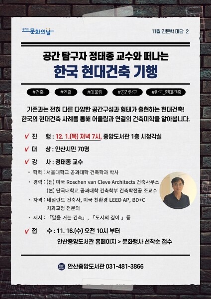 12월 1일 오후 7시에 진행하는 정태종 교수의‘한국 현대건축 기행’은 한국의 건축 사례를 통해 기존과는 전혀 다른 다양한 공간구성과 형태가 출현하는 현대건축의 미학에 대해 알아본다.