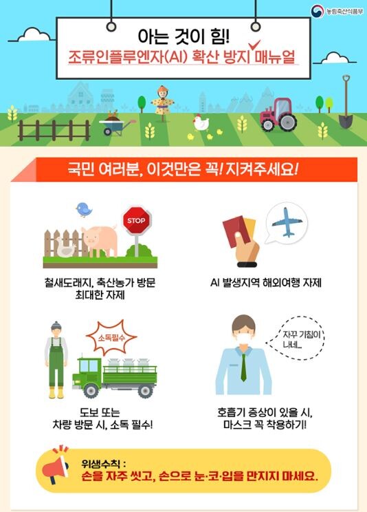 “일반 시민들은 축산농가 또는 철새도래지 방문을 자제하고 30초 이상 자주 손씻기 등 예방수칙을 준수해야 한다”고 강조했다.
