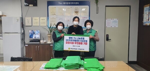 이춘애 연천군새마을회 부녀회장은 “페트병을 재활용함으로써 탄소중립에 앞장서고 행복 1%나눔 사업으로 관내 어려운 이웃을 도울 수 있어 보람을 느낀다”며 “앞으로도 자원재활용수집운동에 적극 앞장서겠다”고 말했다.
