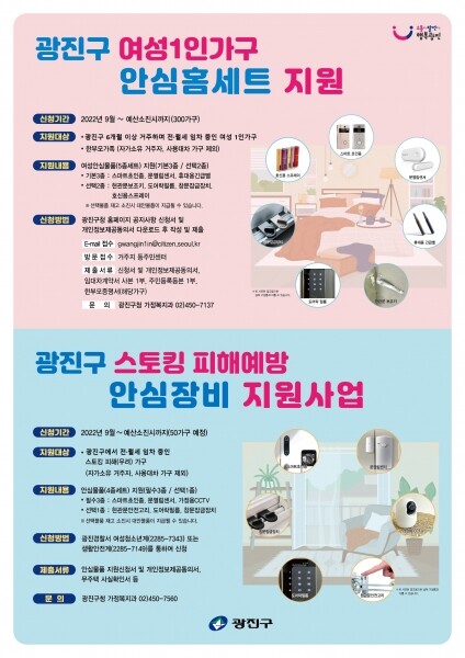 지원 대상은 지역 내 1인 여성 가구 또는 법정 한부모 가정, 범죄 피해 여성 1인 가구이며 지원 자격을 광진구 내 주택, 빌라, 오피스텔 등에 전·월세 1년 이상 거주자에서 6개월 이상 거주자로 완화해 더 많은 주민이 혜택을 받을 수 있도록 지원을 강화했다.