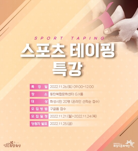 동탄복합문화센터 관계자는 “시민들이 스포츠 테이핑 방법을 미리 익혀두어 일상생활이나 스포츠 활동 시 부상을 예방하고 다친 경우에는 빠르게 대처해 최적의 컨디션으로 스포츠와 일상생활을 즐길 수 있기를 바란다”며 “앞으로도 다양한 운동 특강 프로그램을 추진할 계획”이라고 밝혔다.