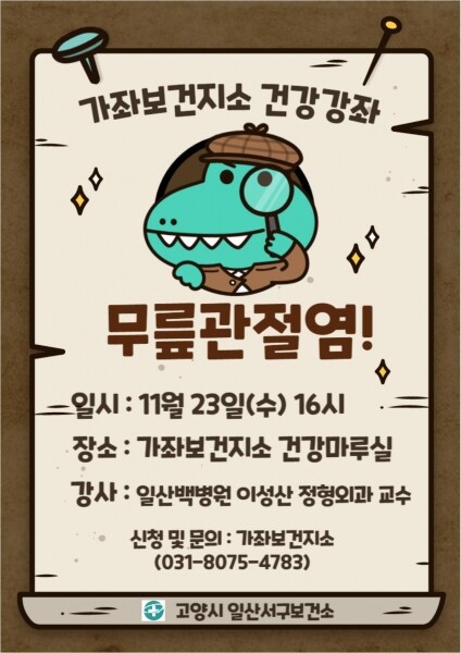 일산서구보건소 가좌보건지소 관계자는 “무릎관절염은 생활습관으로 인해 악화되는 경우가 많다 이번 기회를 통해 일상생활에서 통증을 완화시킬 수 있는 방법을 아시길 바란다”고 말했다.