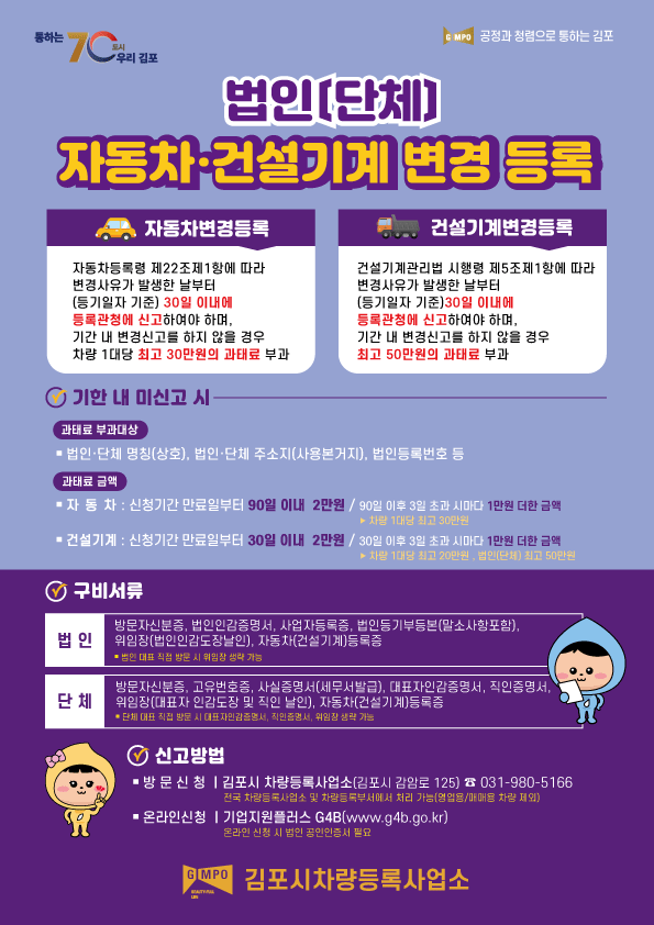 차량 정보 변경 등록은 김포시 차량등록사업소를 비롯한 전국 차량등록 부서에 방문해 신청할 수 있다.