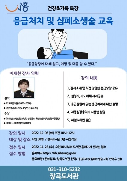 먼저, 시민들이 응급상황에 대해 알고 예방 및 대응할 수 있도록 해주는 강좌인 ‘응급처치 및 심폐소생술 교육’은 현재 소방서 119구급대원인 강사가 12월 6일 오전 10시부터 12시까지 시민 30명을 대상으로 장곡도서관 3층 시청각실에서 진행한다.