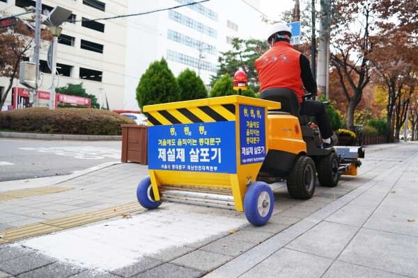 구는 보도용 제설제 살포장치를 이용해 제설작업의 신속성과 효율성을 높이고 눈이 오는 날 보행로에서 미끄러져 넘어지는 낙상 사고를 방지할 수 있다고 설명했다.