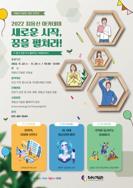 22일에는 신옥철 경기대 교수의‘창의력, 보아야 보인다’강연이 진행되며 23일은 차현주 성균관대 교수의‘AI 시대 청소년의 비전’이라는 주제로 4차 산업혁명을 이끌 인공지능과 메타버스에 대해 알아본다.