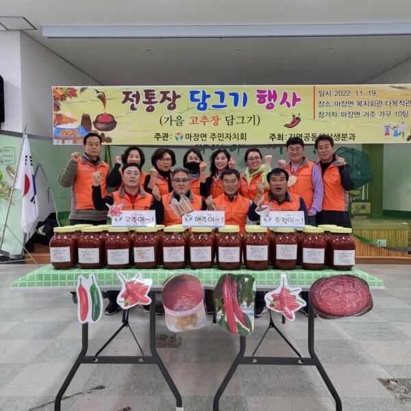 장경희 마장면 주민자치회장은 “젊은 세대와 다문화 가정은 전통적으로 고추장을 담그는 법에 대해 잘 모를 수도 있다는 생각이 들었고 이를 계기로 서로 다른 면민들이 한곳에 모여 배움과 나눔 행사를 진행하게 됐다”고 말했다.