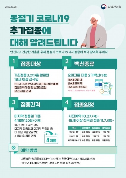이번 동절기 코로나19 추가 접종은 18세 이상 기초 접종 완료자가 대상이며 마지막 접종일 또는 확진일 중 더 늦은 시점으로부터 4개월 이후 접종이 권고된다.