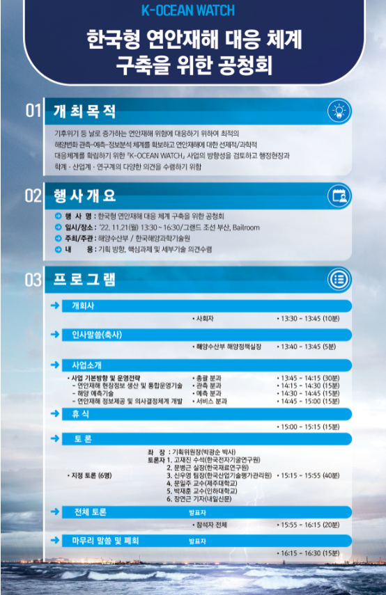 이번 공청회는 연안 재해 관측 및 예측, 정보분석 분야의 산·학·연 전문가를 대상으로 연안재해 대응체계 기술개발 사업 기획의 기술 분야 주요 내용을 공유하고 추진 방향과 보완의견을 수렴하기 위해 마련됐다.