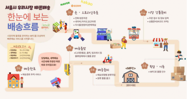 서울시가 시행하는‘우리시장 빠른배송’서비스는 국토교통부가 공모한‘디지털 물류서비스 실증사업’에 선정되어 국비 8억원을 지원 받아 추진하는 것으로 동 사업은 전통시장의 고질적인 배송문제를 해소해 소비자의 편의 증진과 시장 활성화를 도모하고자, 소비자 요구에 맞추어 당일배송 등 다양한 배송이 가능토록 소상인들이 밀집한 전통시장을 중심으로 공동물류를 구현하는 사업이다.