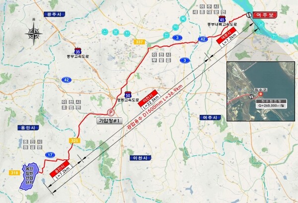 용인 반도체클러스터 공업용수는 여주시 남한강 여주보에서 취수해 이천시를 거쳐 총 36.9㎞에 이르는 관로를 통해 일일 26만5000톤이 공급될 예정이다.