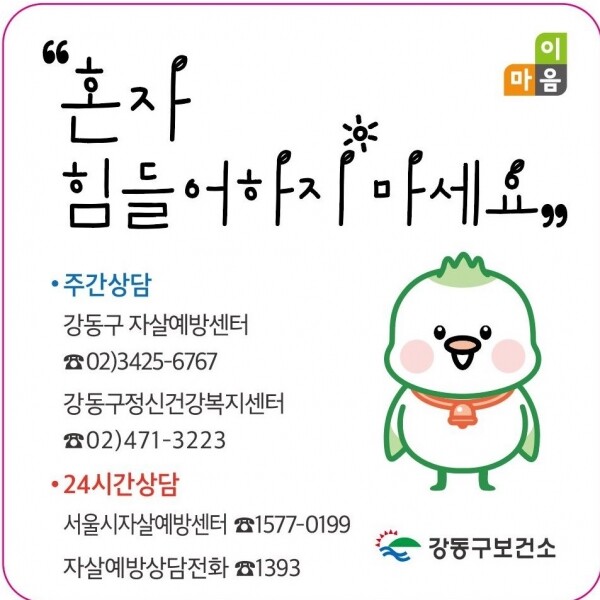 자살 고위험군 밀착 관리를 위해 자살률이 높게 나타나는 기간을 중심으로 천호역, 암사역 등 주민 접근성이 높은 위치를 선정해 마음건강 자가진단 리플릿을 비치하거나 강동구 옥외 전광판·공동주택 미디어보드 등을 통해 도움 기관을 적극 안내하는 등 다각적인 홍보 활동을 펼쳐왔다.