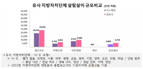 김포시의 2021년 살림 규모는 2조 3,444억원으로 유사 지방자치단체 평균액 1조 9,243억원보다 4,201억원 많고 전년도 결산액 2조 3,007억원 대비 437억원 증가했다.
