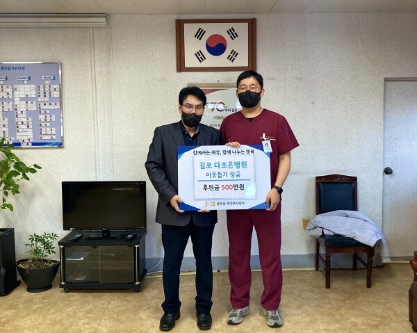 이에 조재국 통진읍장은 “지역주민들을 위해 따뜻한 사랑나눔을 실천해주신 김포다조은병원에 깊이 감사드리며 도움의 손길이 필요한 우리 이웃들에게 온정의 마음을 담아 성금이 의미있게 쓰이도록 하겠다”고 말했다.