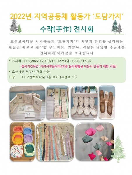 오산시육아종합지원센터 김혜은 센터장은 “이번 전시회를 통해 자연 친화적인 활동이 활성화 되길 바라며 이웃을 위해 조금이나마 힘이 될 수 있는 따뜻한 나눔을 실천할 수 있도록 노력하겠다”고 밝혔다.